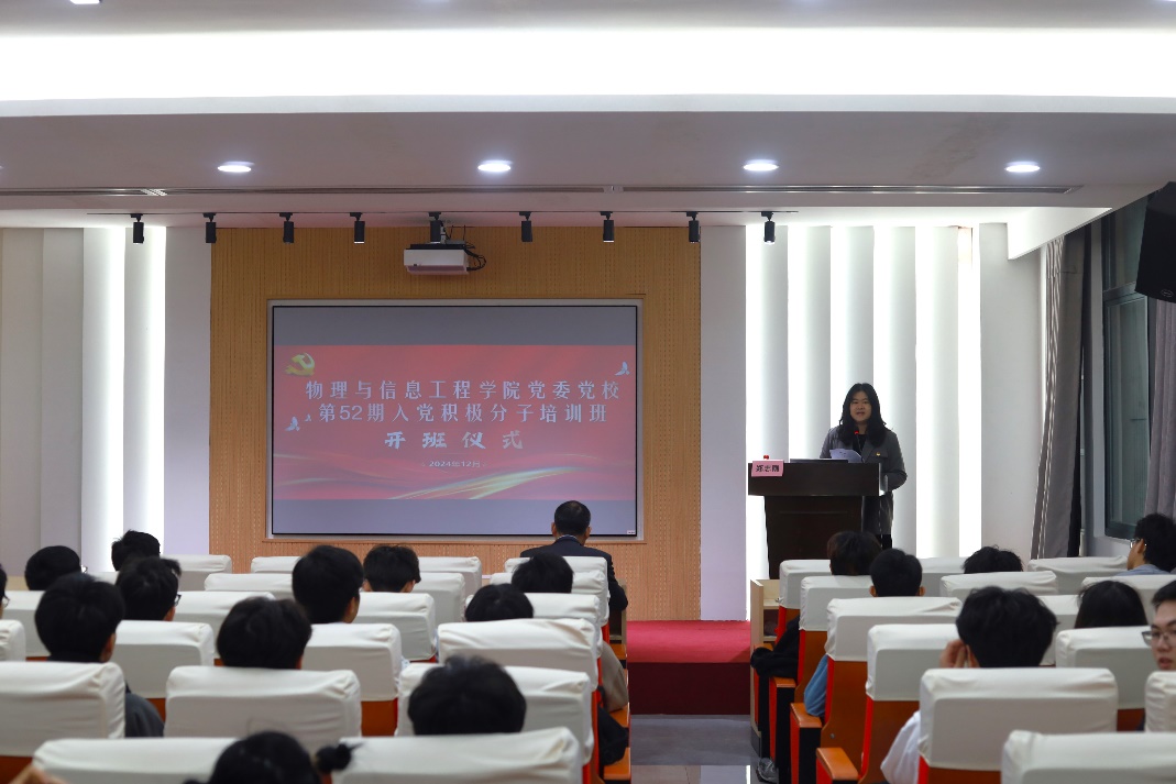 为深入学习贯彻党的二十届三中全会精神,提升入党积极分子的政治素养与理论水平,确保党员发展的质量。物信学院12月6日至7日在思源厅和文2-204教室成功举办物信学院党委党校第52期入党积极分子培训班。学院党委副书记郑志刚出席了本次分党校开班仪式,培训班由刘媛老师主持,共有一百余名入党积极分子参加了开班仪式和系列学习,此次集中培训采取专题教学、自主学习、线上学习、研讨交流、撰写心得、结业考核等形式进行开展。